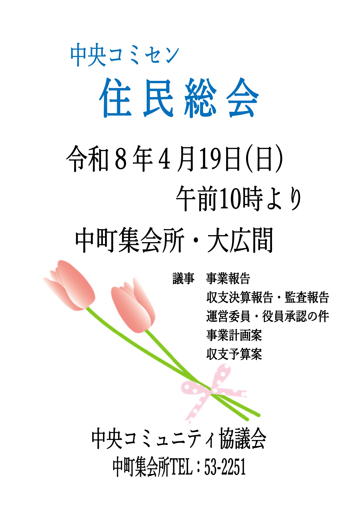 中央コミセンの住民総会を令和8年4月19日 (日)午前10時より中町集会所・大広間にて開催いたします皆様のご参加をお待ちしています。